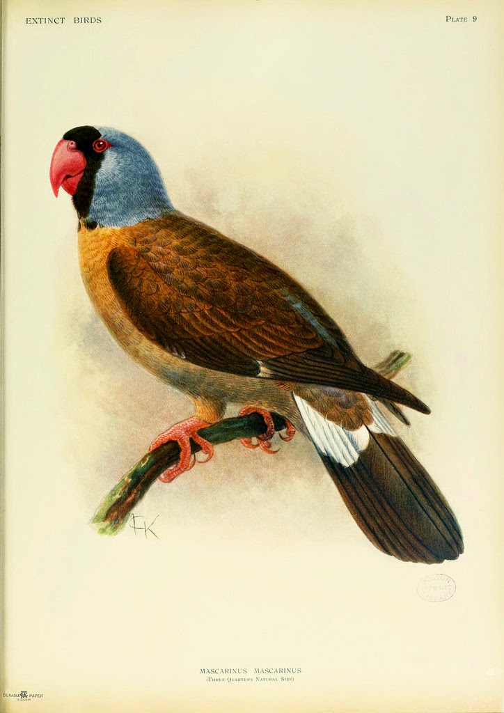| The Mascarene Parrot. Now Extinct. Rothschild, Lionel Walter Rothschild. Extinct Birds (1907). http://biodiversitylibrary.org/page/38665729. |