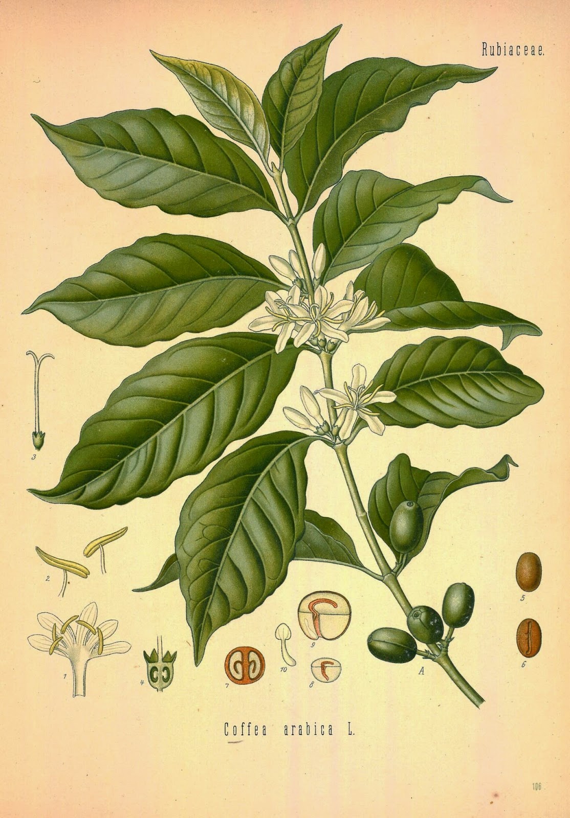 | Coffea arabica, which accounts for 75–80 percent of the world’s coffee production. It is also believed to be the first species of coffee to be cultivated. Köhler’s Medizinal-Pflanzen (1883-1914). http://biodiversitylibrary.org/page/303146. |