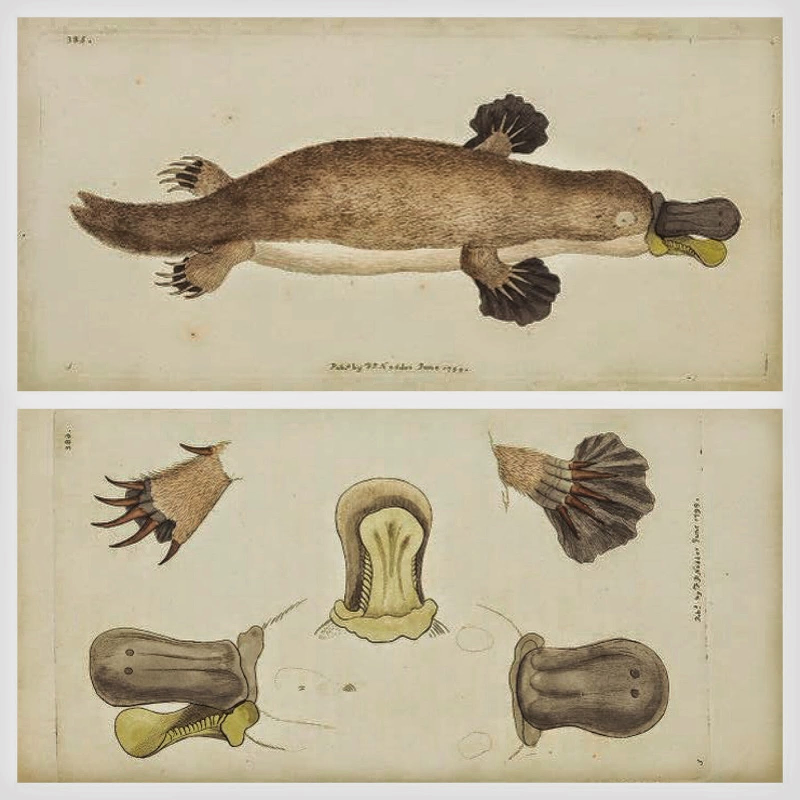| The first published illustration of the Duck-billed Platypus. Shaw, George. The Naturalist’s Miscellany, or Coloured figures of natural objects, Vol. 10 (1799). http://biodiversitylibrary.org/page/40321089. |