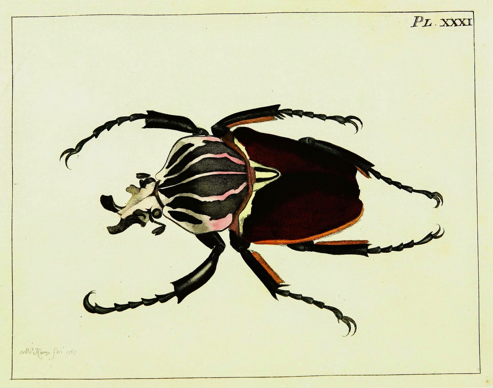| First published illustration of an African Goliath Beetle. From Illustrations of Natural History (1770-82), by Dru Drury. http://biodiversitylibrary.org/page/42122956. |