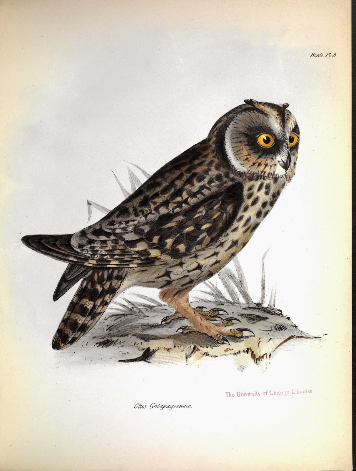 | Short-eared Owl. Illustrated as part of Darwin’s Zoology of the Voyage of the H.M.S. Beagle (1839-43), which presented identification and descriptions for the zoology observed and collected during one of natural history’s most famous expeditions. http://biodiversitylibrary.org/page/40300038. |