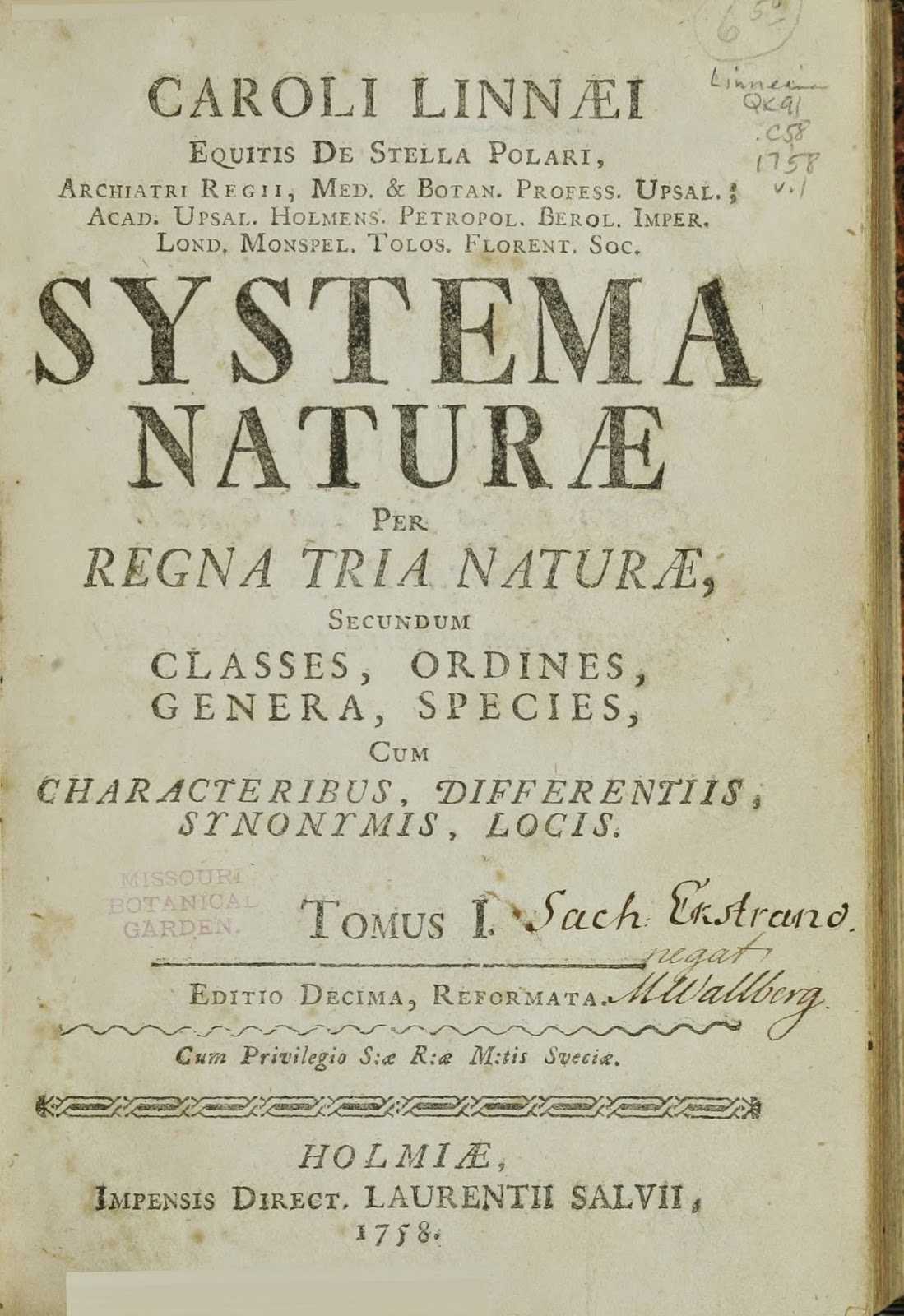 | Linnaeus, Carl. Systema Naturae, 10th Ed. (1758-59). Considered the beginning of zoological nomenclature, in which Linnaeus introduced binomial nomenclature for animals. http://biodiversitylibrary.org/page/726886. |