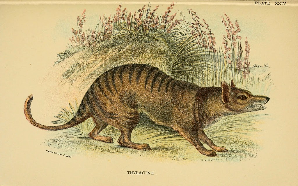 | The Thylacine, an apex predator in Australia, Tasmania and New Guinea before it became extinct in the early 20th century. Lydekker, Richard. A hand-book to the marsupialia and monotremata. (1896). http://biodiversitylibrary.org/page/15043966. |