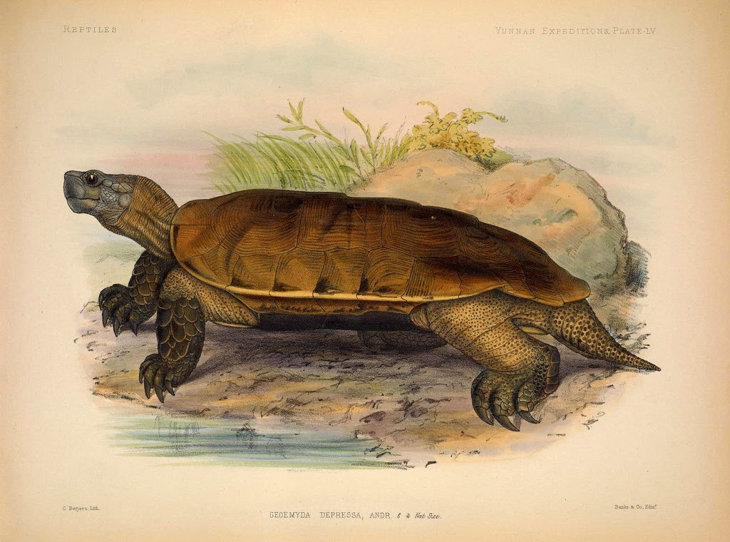 | Akaran Forest Turtle. Thought extinct until rediscovered in a Chinese food market in 1994. Anderson, John. Anatomical and zoological researches. v. 2 (1878). http://biodiversitylibrary.org/page/34177985. |