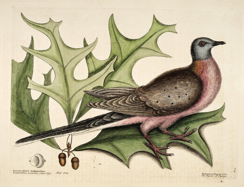 | First published illustration of a Passenger Pigeon, Extinct. Catesby, Mark. The natural history of Carolina, Florida, and the Bahama Islands (1754). http://biodiversitylibrary.org/page/10900155. |