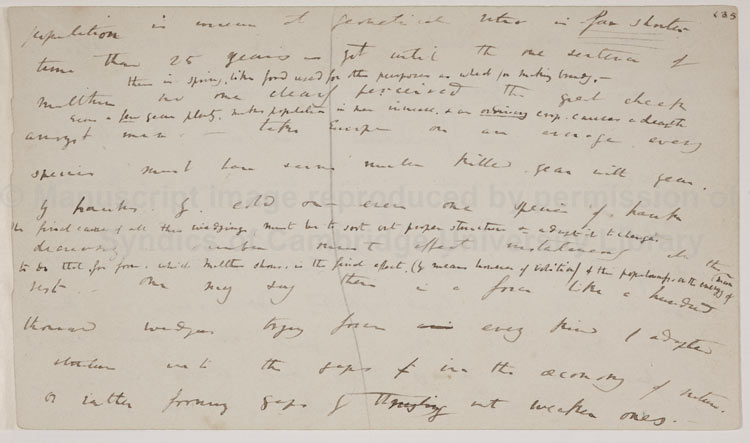 28th. «I do not doubt, every one till he thinks deeply has assumed that increase of animals exactly proportiona[l] to the number that can live.—» We ought to be far from wondering of changes in number of species, from small changes in nature of locality. Even the energetic language of ‹Malthus› «Decandoelle» does not convey the warring of the species as inference from Malthus.— … population in increase at geometrical ratio in FAR SHORTER time than 25 years— yet until the one sentence of Malthus no one clearly perceived the great check amongst men.— … One may say there is a force like a hundred thousand wedges trying force ‹into› every kind of adapted structure into the gaps ‹of› in the œconomy of Nature, or rather forming gaps by thrusting out weaker ones. «The final cause of all this wedgings, must be to sort out proper structure & adapt it to change.—»