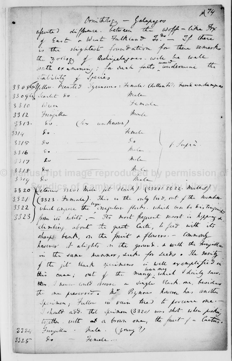 | Ornithology Notes. Pg. 74. Cambridge University Library. |