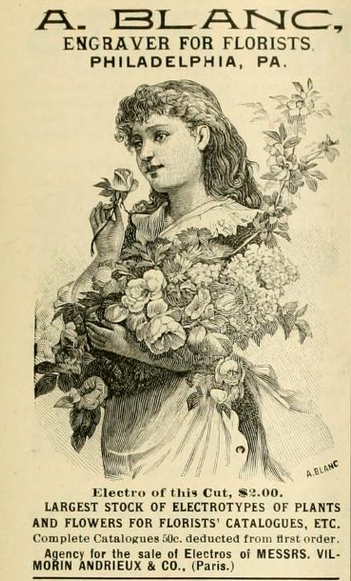| Albert Blanc prepared and sold thousands of illustrations for seed catalogs, including many for J. Horace McFarland. Here’s an ad Blanc placed in the 1889-90 volume of The American Florist. http://biodiversitylibrary.org/page/24949896. |