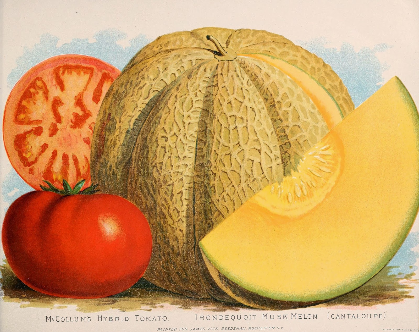 | Vick’s Floral Guide, 1889. McCollum’s Hybrid Tomato, Irondequoit Musk Melon chromolithograph. http://biodiversitylibrary.org/page/44438925. |