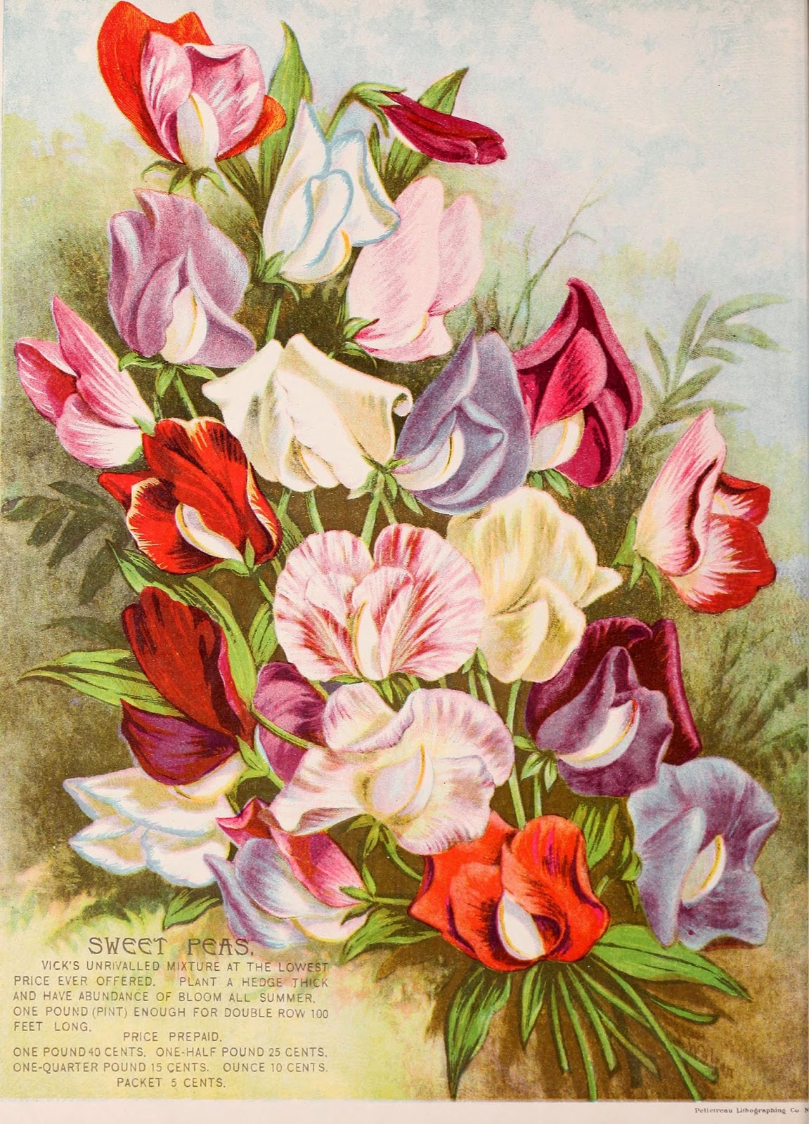 | Vick’s Floral Guide, 1895. Sweet Peas chromolithograph. http://biodiversitylibrary.org/page/44442935. |