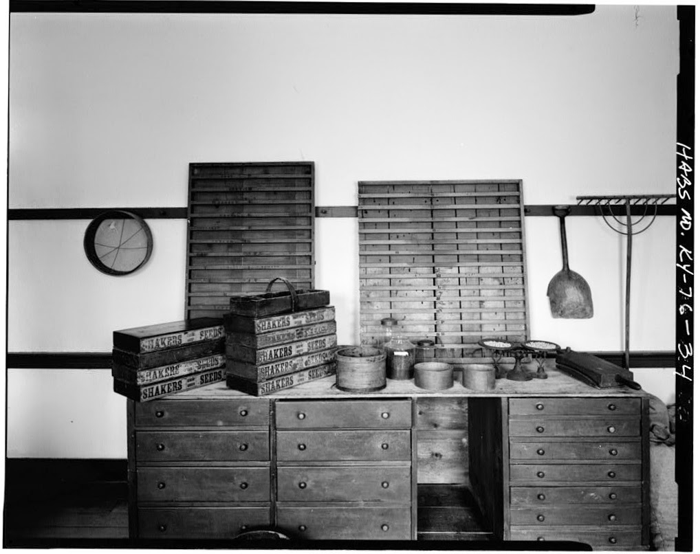 | Seed Room with display containers, Shaker Centre Family Dwelling House, Shakertown, Mercer County, Kentucky (Library of Congress Prints and Photographs Division; HABS KY,84-SHAKT,2—34) |