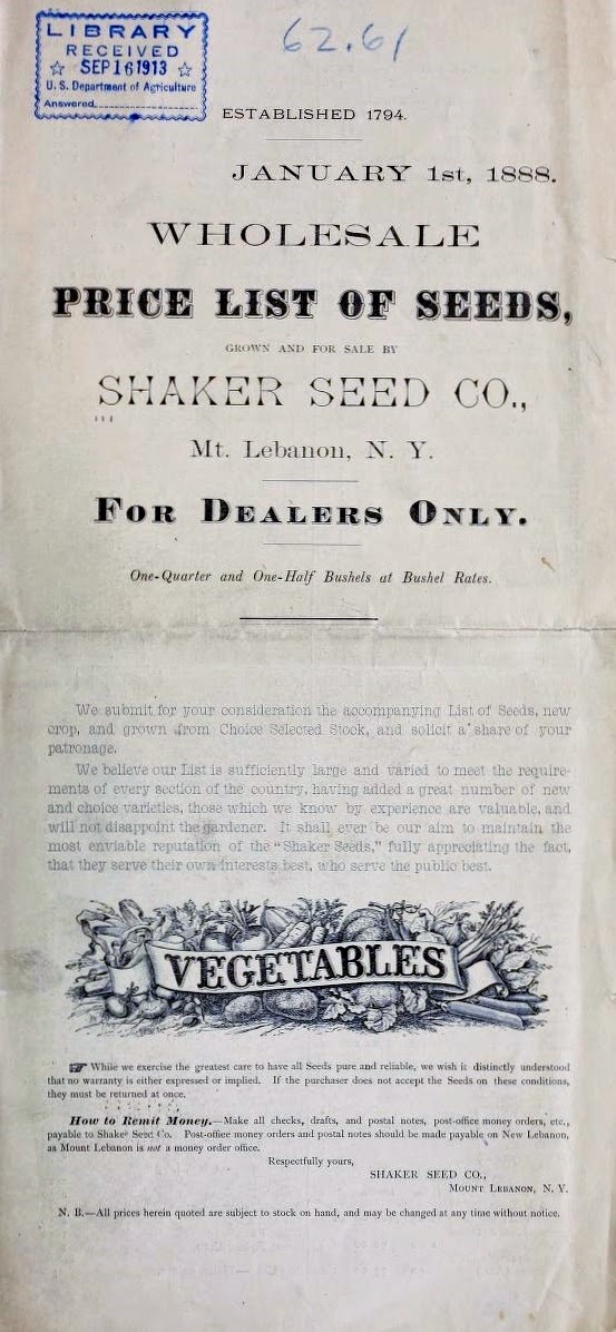 Wholesale price list of seeds by the Shaker Seed Company. New Lebanon, New York, 1888 (Henry G. Gilbert Nursery and Seed Trade Catalog Collection, National Agriculture Library; image from the Biodiversity Heritage Library)