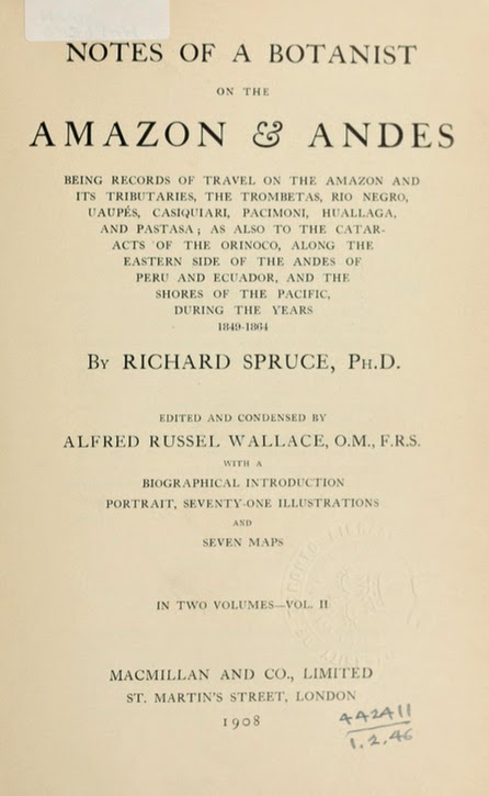 | Spruce, Richard. Notes of a botanist on the Amazon and Andes. 1908. http://www.biodiversitylibrary.org/bibliography/17908#/summary. |