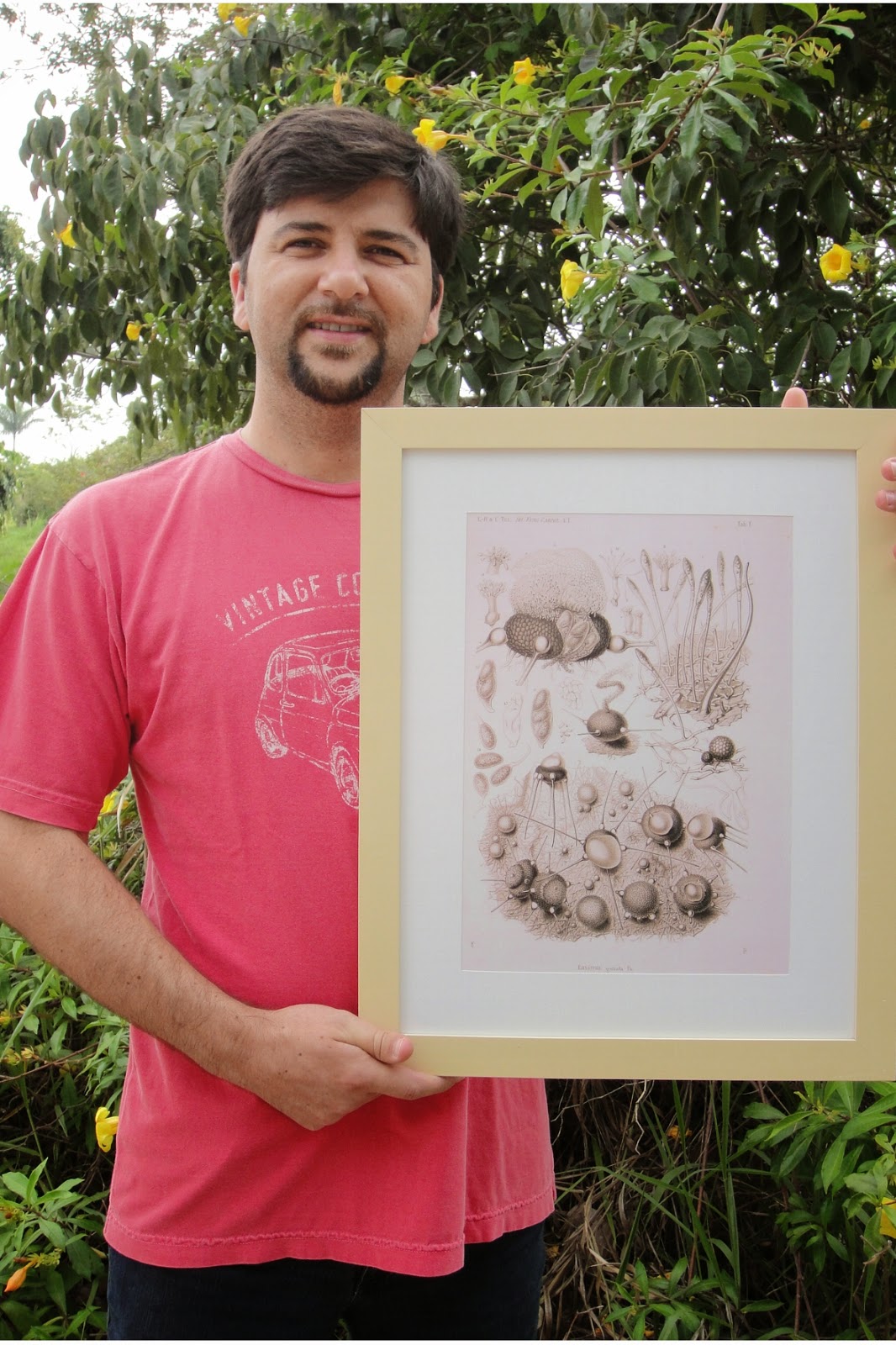 | Fig. 1. Dr. Dartanhã J. Soares, plant pathologist researcher at the Brazilian Corporation for Agricultural Research (Embrapa), holding his new decoration piece which was downloaded through BHL from Tulane’s Brothers Selecta Fungorum Carpologia. Vol.1 http://biodiversitylibrary.org/page/3448217. |