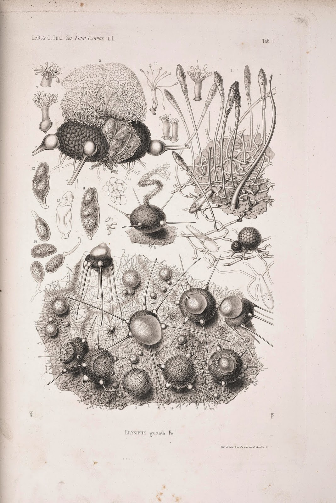 “My favorite title [in BHL] is Selecta fungorum carpologia from the Tulasne brothers,” begins Soares. “The line drawings are so amazing, so ‘real,’ and with such richness of detail that I constantly ask myself how they did that with such rudimental microscopes. If you have any doubt about this, look at Erysiphe guttata, which nowadays is called Phyllactinia guttata, in Selecta Fungorum Carpologia Vol 1, Tab.I (Fig. 4). The sexual stage, the globose bodies, of this fungus are smaller than a pin head, and even so can you see the richness of detail? Additionally, the Tulasne brothers established the pleomorphism – which is the capacity of a single organism to show distinct forms – of fungi and summarized their results in Selecta fungurom carpologia, which became a landmark [title] on fungi research. Well, at this point, you’re probably asking yourself, where are the Martians? Don’t you see them? Look more carefully at Fig. 4. Does the general aspect of the sexual bodies of P. guttata remind you of anything? No? Well, maybe you should take a second look at some of the images from The War of the Worlds. Ha-ha, probably now you are wondering if H.G. Wells got inspirations from P. guttata to describe the invading martians, aren’t you?”