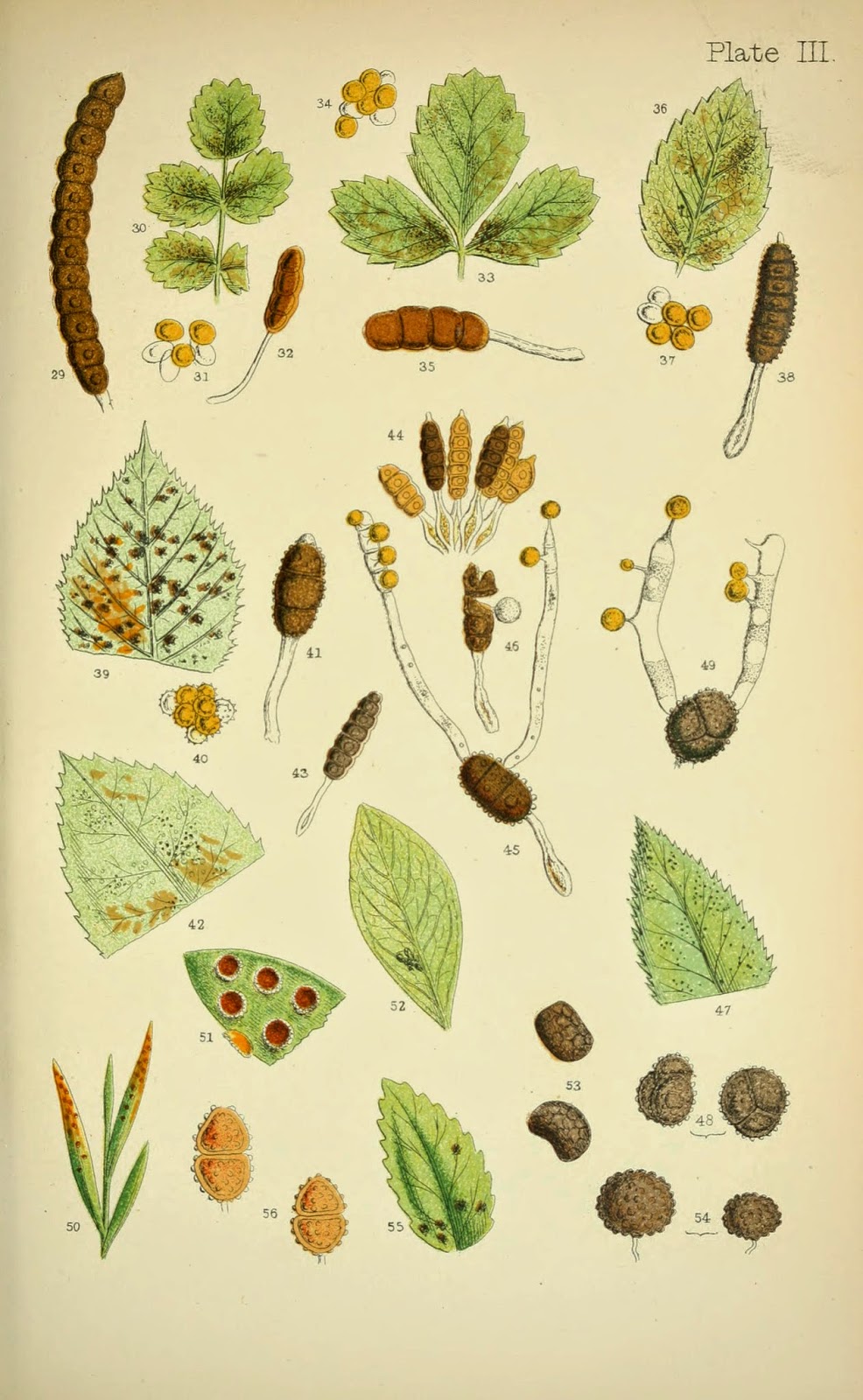 | Fig. 2. Symptoms and spore diversity of rust fungi from Rust, smut, mildew and mould: an introduction to the study of microscopic fungi. By M.C. Cooke and illustrated by J.E. Sowerby. London, 1898. http://biodiversitylibrary.org/page/3275344. |