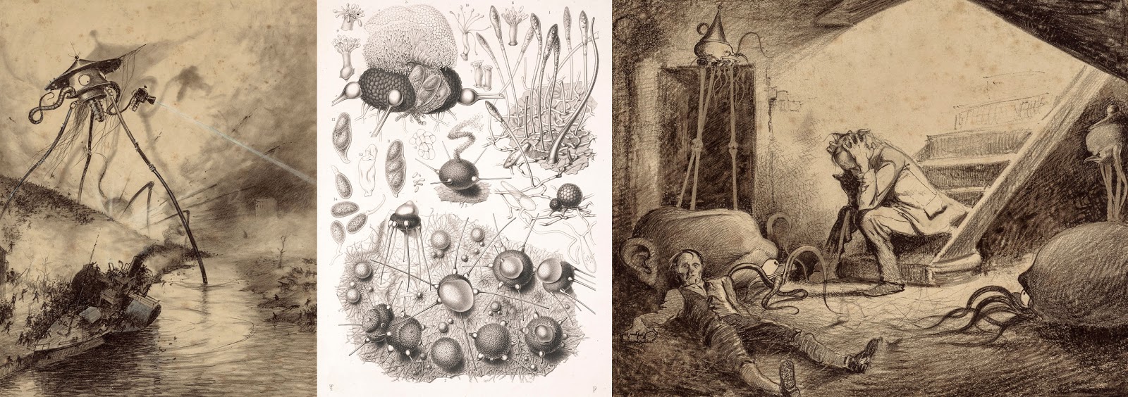 | Comparing Corrêa’s Martians to Tulasnes’ fungi. Left: “Martian Gas Cannon.” Right: “Death of Curate.” Both from The War of the Worlds, Belgium edition, 1906. Pencil and Ink drawings by Henrique Alvim Corrêa. Images from Heritage Auctions. Images obtained from: http://www.huffingtonpost.com/2015/05/05/war-of-the-world-illustrations-auction_n_7214410.html. Center image: Phylactinia guttata from Selecta Fungorum Carpologia. Vol.1, Tab.I, Tulasne, E.L.-R and C. 1861. http://biodiversitylibrary.org/page/3448217. |