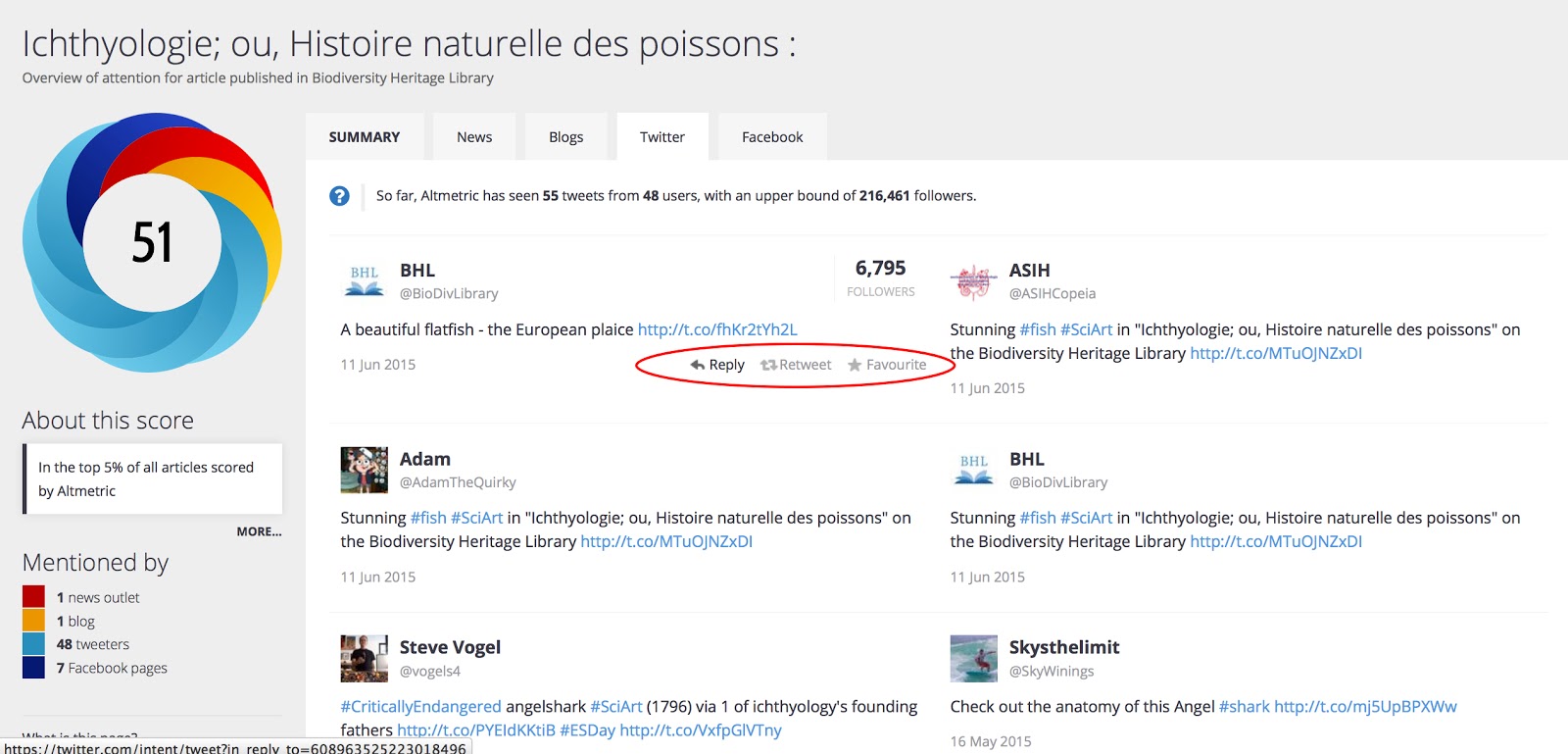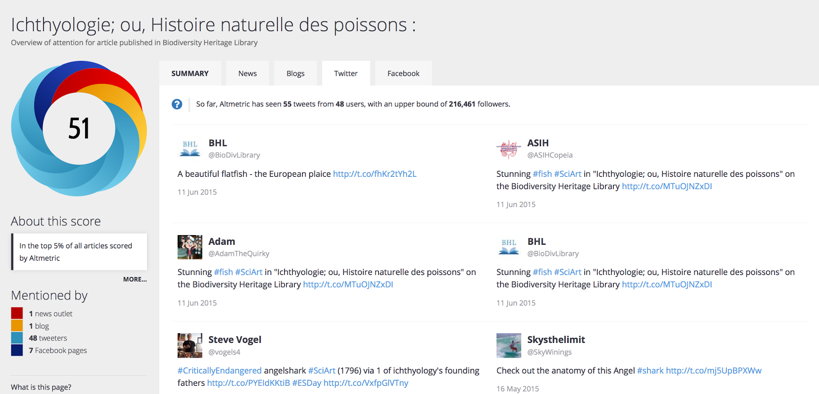 We’re excited to announce that today, as part of our Mining Biodiversity project, we’ve launched two new features on BHL that will allow you to do all of the above! These features are Altmetric and MyTweeps.