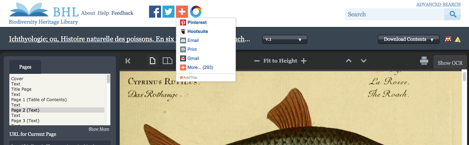 Altmetric dynamically tracks new online mentions of BHL books. That means that if you tweet or post about a book in BHL (and include the link to it), Altmetric will subsequently index that post and make it available in BHL via the described Altmetric icon. Thanks to the social sharing buttons we’ve added to BHL (see below), it’s easier than ever to share your thoughts, expertise, or comments about a BHL book on social media. And thanks to our Altmetric implementation, it’s also now easier than ever for others to find those comments in BHL and benefit from your knowledge!