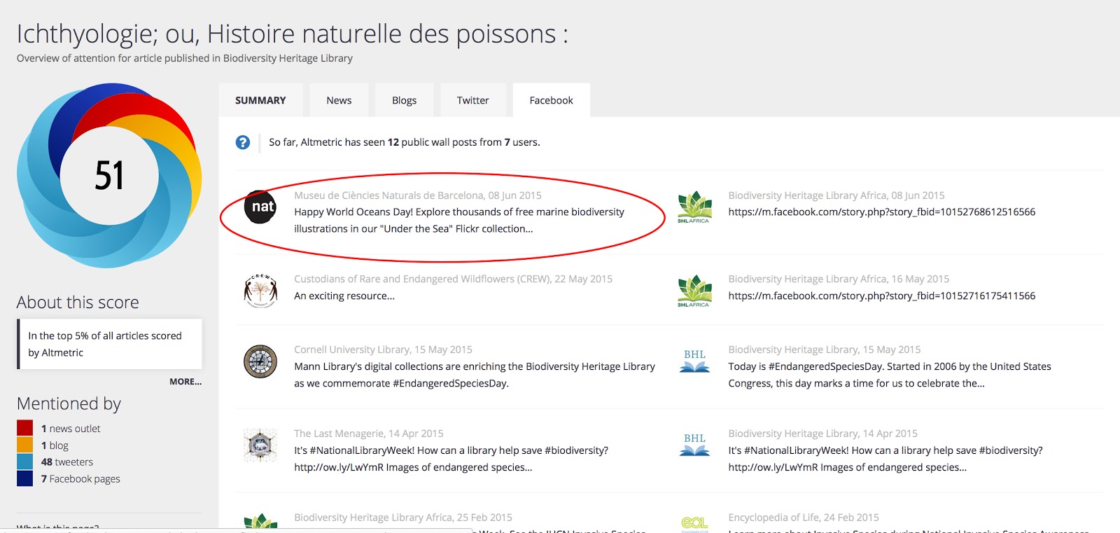 Here are links to just a couple of BHL books that have been indexed by Altmetric. Click on the donut icon in the book viewer header to explore the fascinating conversations about each item. You can contribute directly to the online conversations using our social sharing buttons in BHL (see above), or by clicking on the appropriate links in the Altmetric dashboard (see below). Or start your own conversations about BHL books and see them appear (note the time lag for indexing on various sites above) in BHL!