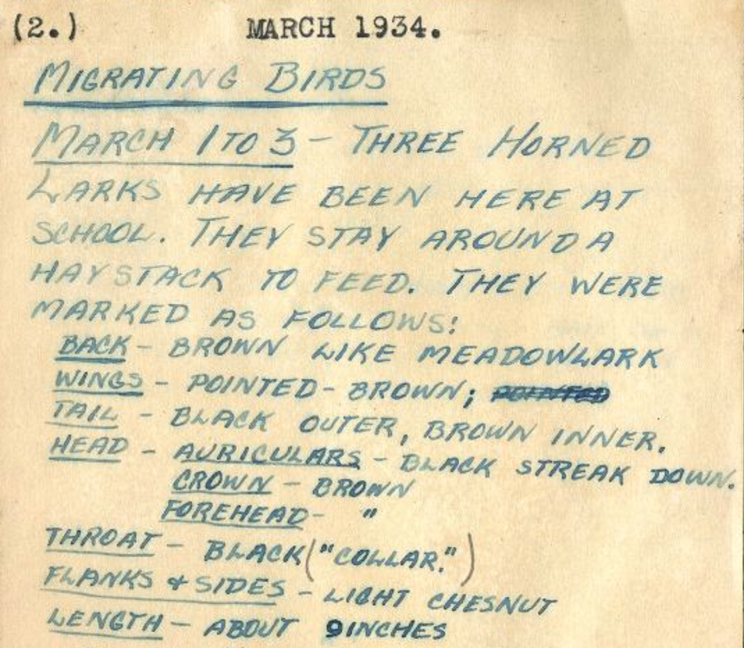 “March 1 to 3 – Three horned larks have been here at school. They stay around a haystack to feed. They were marked as follows: