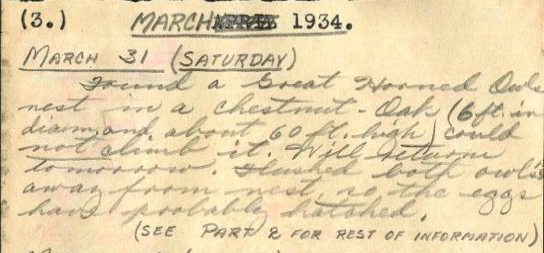 Found a Great Horned Owl’s nest in a chestnut-oak (6 ft. in diam. and about 60 ft. high) could not climb it. Will return tomorrow. Flushed both owls away from nest, so the eggs have probably hatched. (See part 2 for rest of information)”