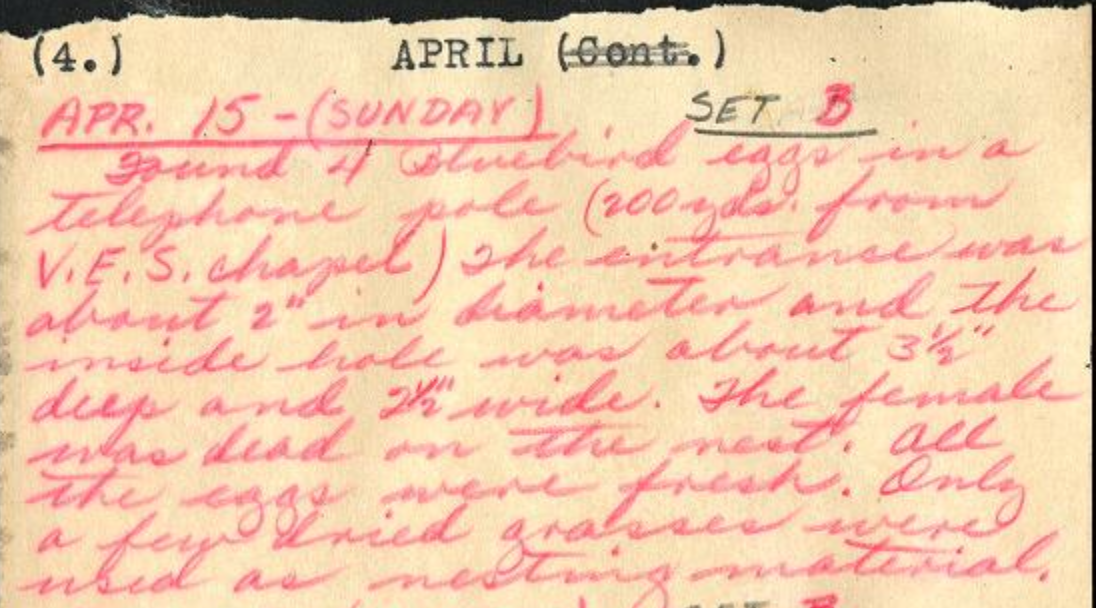 Found 4 bluebird eggs in a telephone pole (200 yds. from V.E.S. chapel). The entrance was about 2″ in diameter and the inside hole was about 3 1/2″ deep and 2 1/2″ wide. The female was dead on the nest. All the eggs were fresh. Only a few dried grasses were used as nesting material.”