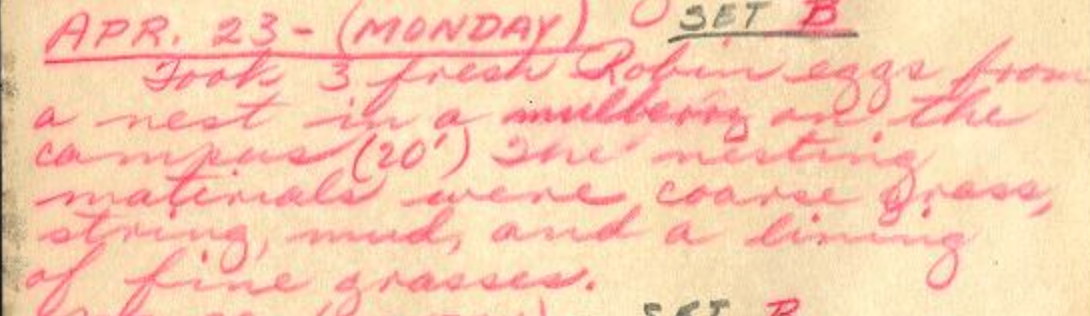 One of these field books was written by Joshua F. B (Fry Bullitt) Camblos (1916-2012). Camblos was a medical doctor with a keen interest in ornithology, and his field books contain details about the birds, eggs, and nests he spied in the woods of Virginia. His field book available in BHL documents these observations from February-April 1934, including descriptions of nests, condition and appearance of eggs, area vegetation, and bird behavior.