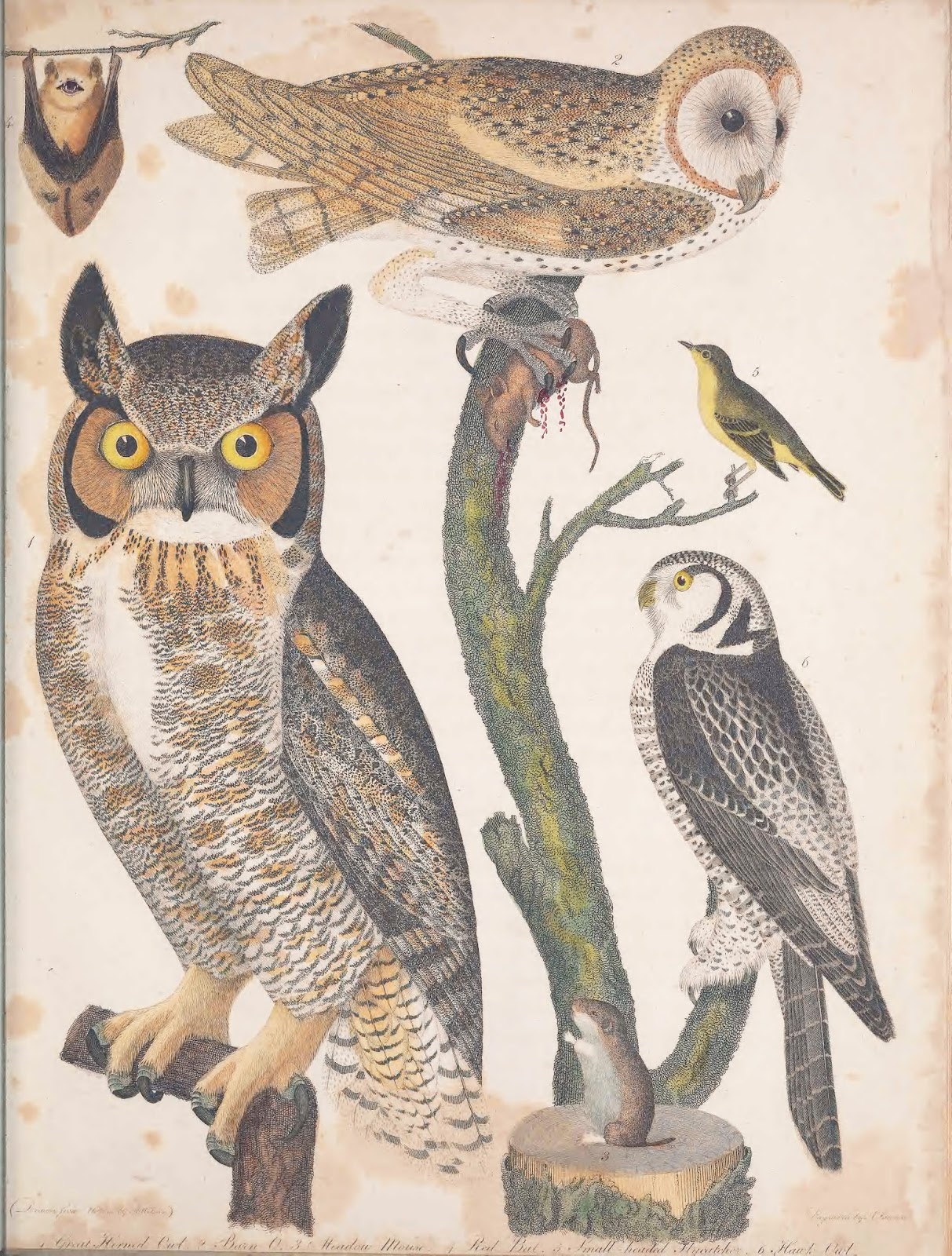 Here we see the great horned owl (lower left) amongst some of his winged friends (ave and mammal alike!). This illustration hails from Alexander Wilson’s American Ornithology. Wilson, called the “Father of American Ornithology” by some, traveled over 10,000 miles across North America observing and collecting birds, which he chronicled and illustrated in American Ornithology. The publication included over 260 species, 48 of which were new to science, and was published in at least 10 editions over 70 years. Sadly, he died at the age of 47 from dysentery and exhaustion. Learn more about Wilson’s incredible travels, and his other love – poetry – in a past blog post.