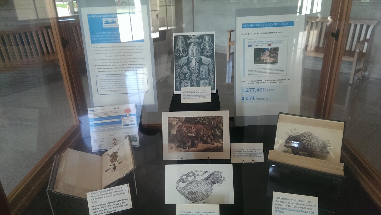 | “Celebrating the Biodiversity Heritage Library: Supporting Scientists Worldwide” exhibit at the University of Illinois at Urbana-Champaign’s Main Library Marshall Gallery. Image Credit: Kelli Trei. |
