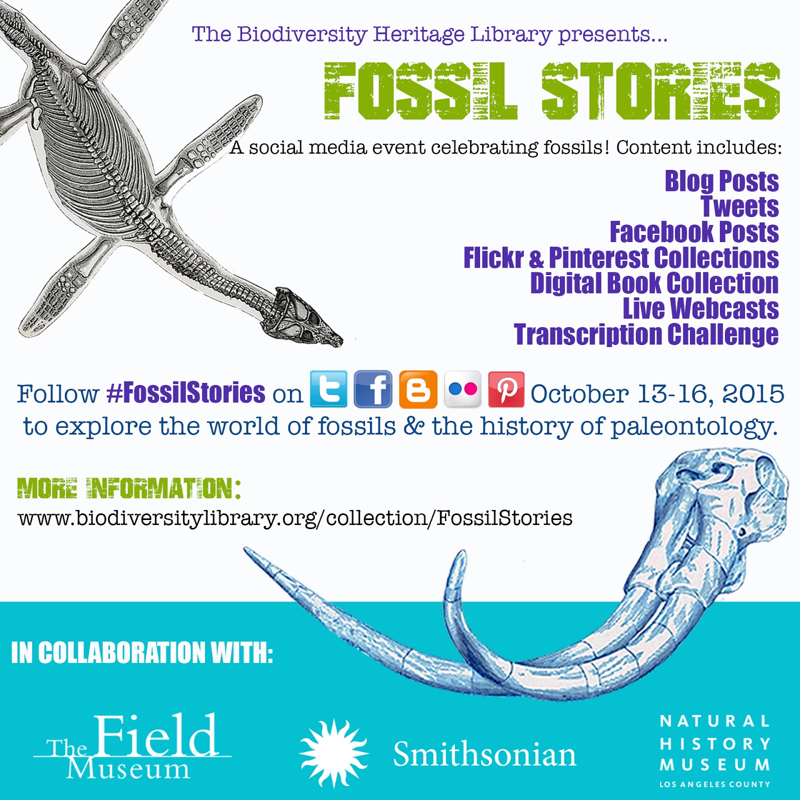 Fossil Stories, presented by the Biodiversity Heritage Library in collaboration with several of our partner institutions, explores the world of fossils, the history of paleontology, and the men, women, and publications that shaped our knowledge about life preserved in rocks. October 13-16, BHL and our participating partner institutions will be producing a plethora of fossil content, which will publish on our blog, Twitter, and Facebook. All content will be tagged with the hashtag #FossilStories. We’ll also have hundreds of fabulous historic fossil illustrations available in Flickr and Pinterest, as well as a collection of seminal books in the history of paleontology in our BHL Fossil Stories collection.