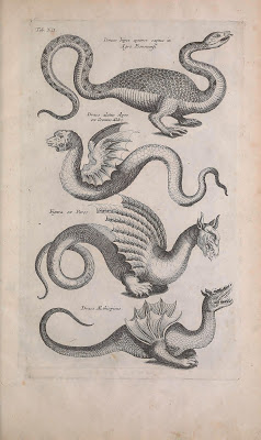 | Various dragon forms. Dragon myths may have been inspired in part by encounters with fossils. Jonstonus, Joannes. Historiae naturalis de quadrupedibus libri. pts. 2-5 (1657). http://biodiversitylibrary.org/page/40918325. Digitized by Smithsonian Libraries. |