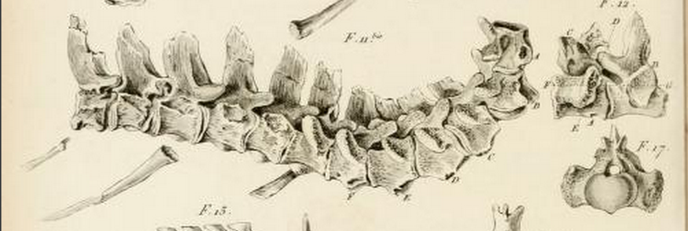 | Mosasaur vertebrae. Camper, Adriaan Gilles. Annales du Muséum national d’histoire naturelle. v. 19 (1812). http://biodiversitylibrary.org/page/3499442. Digitized by Natural History Museum, London. |