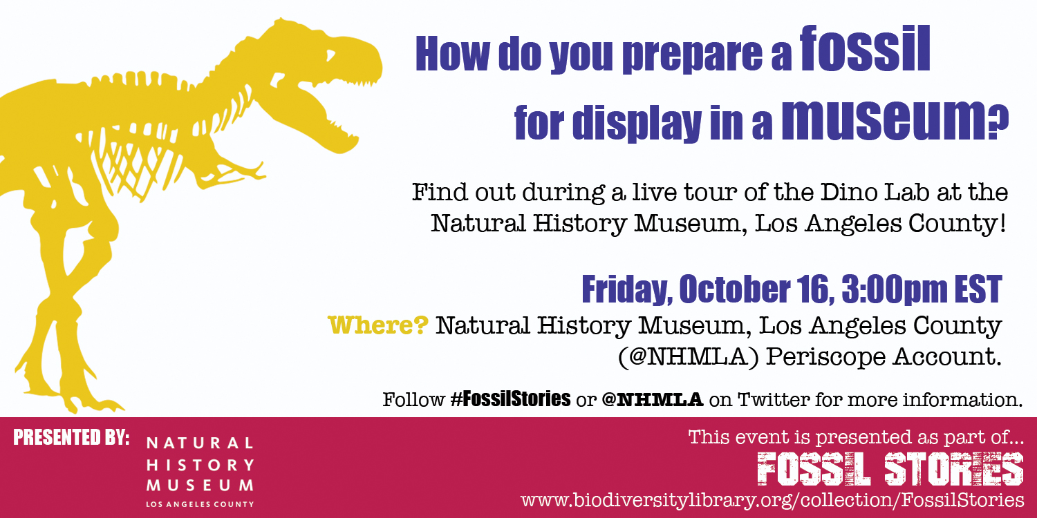 How would you like to get a behind-the-scenes tour of the Dino Lab at NHMLA? Well, you’re in luck! Tune in today, October 16, 2015, at 3pm EST on the NHMLA Periscope account for a live tour of the Dino Lab as part of our Fossil Stories event. You’ll get up close and personal with the specimens being worked on and the people who care for these incredible fossils.