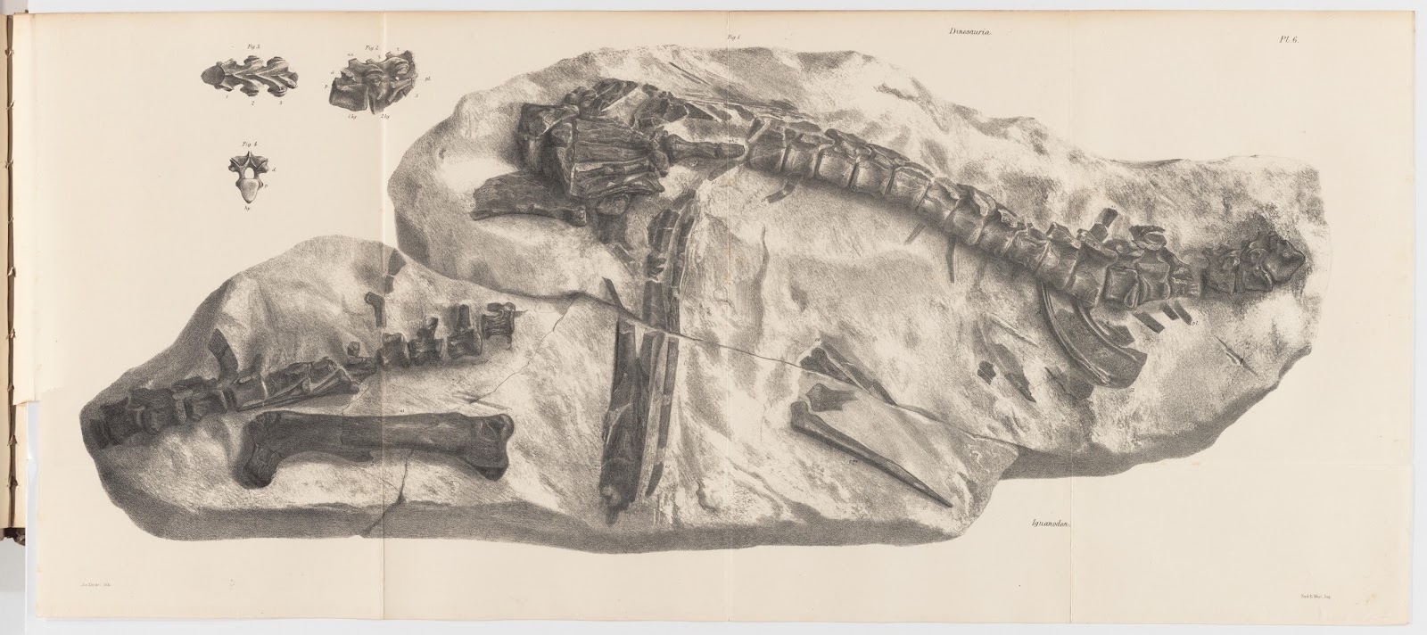 Owen was fascinated by the specimens his peers had discovered. He examined William Buckland’s Megalosaurus specimens at Oxford and Gideon Mantell’s Iguanodon and Hylaeosaurus specimens housed in the British Museum. From these, and examinations of other collections (most notably a sacrum from an Iguanodon in the collection of fossil collector William Devonshire Saull that likely first inspired Owen’s discovery), Owen determined that these three animals shared unique anatomical features that united them together while also separating them from other known groups. It was the fusion of five vertebrae at the base of the spine, observed in some of the Megalosaurus and Iguanodon fossils that Owen consulted and inferred in the Hylaeosaurus fragments – a feature unknown in other reptiles – that fueled Owen’s confidence in his new group.