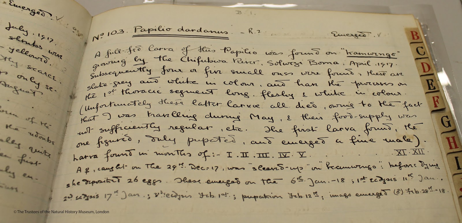 A recent article in The Linnean (VOL 31(2) OCT 2015) by Hellen Pethers (Reader Services Librarian, Library and Archives, Natural History Museum, London, UK) and Dr. Blanca Huertas (Senior Curator of Lepidoptera, Life Sciences Department, Natural History Museum, London, UK) illustrated the importance of field notes to museum research. The paper focuses on the collections of Hereward Chune Dollman, an entomologist who worked extensively on the natural history and identification of insects in Zambia. Dollman’s natural history collections, which were donated to the British Museum of Natural History (now the Natural History Museum, London) upon his death, include 3,500 butterfly specimens comprising 300 species, 157 watercolor drawings of caterpillars, and a notebook containing data related to his breeding and collecting. Dollman’s caterpillar illustrations link directly to his scientific notes through unique identification codes, thus allowing researchers to explore details of the caterpillars’ lives, their transformation to adult forms, and the study sites from which Dollman collected. The watercolors are the only record of the immature counterparts of the adult specimens that Dollman studied.