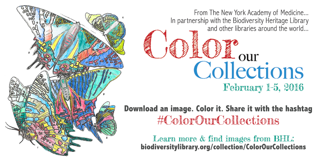 Join us for the Color Our Collections event this week, February 1-5, 2016. Led by The New York Academy of Medicine, the event invites you to download images from library and cultural institution collections, color them, and share them on social media using the event hashtag #ColorOurCollections. With millions of natural history illustrations produced over 500 years in our collection, BHL is thrilled to participate in the event.