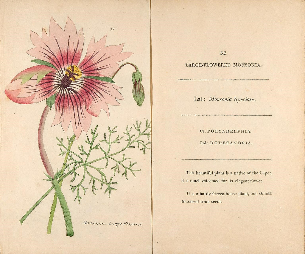 | Monsonia speciosa illustrated by Henrietta Maria Moriarty. Fifty plates of green-house plants, drawn and coloured from nature (1807). http://biodiversitylibrary.org/page/48345267. Digitized by Chicago Botanic Garden, Lenhardt Library. |