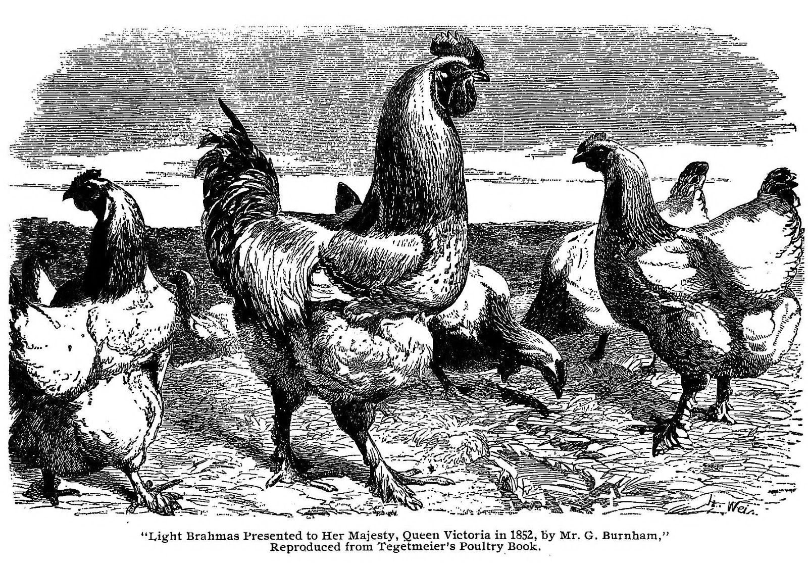 George Burnham, who penned an account of hen fever in his The history of the hen fever. A humorous record, contributed to the Brahma’s association with the fever by sending Queen Victoria nine of his finest stock in 1852, resulting in a significant increase in their popularity and price.