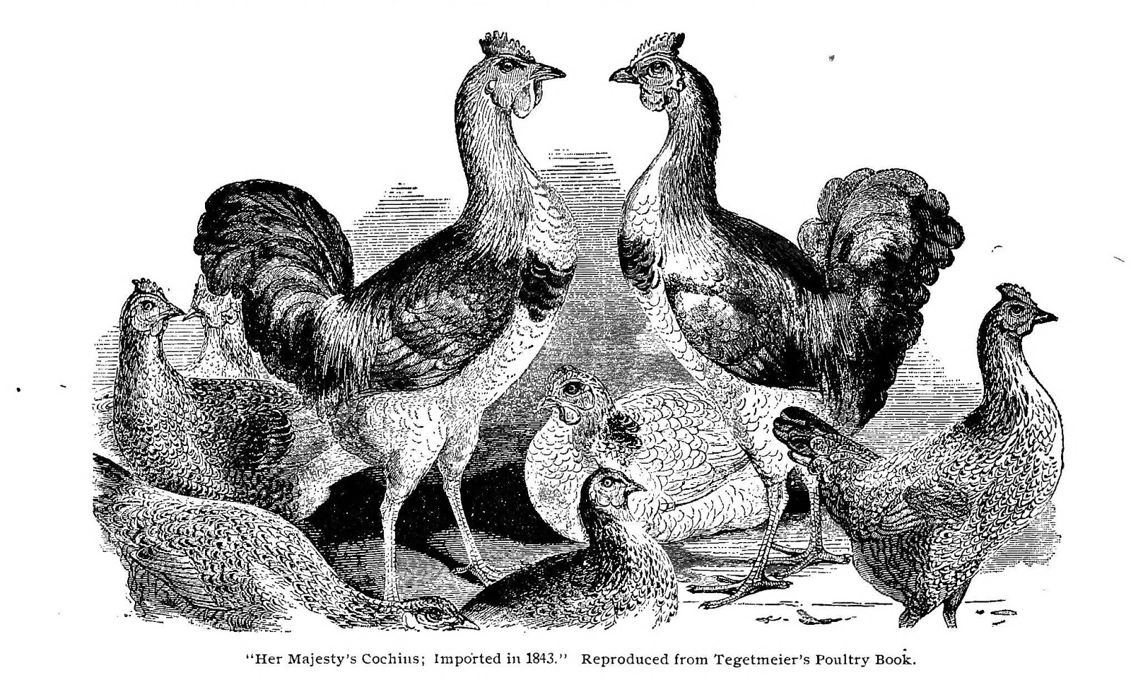 “A drawing of those birds was given in the Illustrated London News of that date, from which and the description it is manifest that they had absolutely no points of the Cochin at all, save perhaps yellow legs and large size…But one thing about them there was; these fowls were not only big, but they probably really did come from Cochin China, and from them and that fact came undoubtedly the name, which will now belong, while poultry breeding lasts, to another fowl that has no right to it at all.”