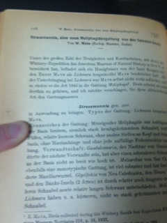 I conducted an in-depth analysis of the 37 genera with fewer than ten mentions in BHL to figure out possible reasons for the paucity of literature. I determined that this lack of literature could be attributed to such things as the more-recent description of some of the genera, such as within the past 20 years, to the locality of some genera, as in some birds being endemic to far-away (to 19th century European ornithologists) places like New Guinea and Mozambique, and to taxonomic changes to the genera over the years. I then looked for the first mention of each of the 37 genera in books and journal articles online and in print, in addition to submitting scan requests for the books we have access to that weren’t already in BHL. There was something surreal about trekking up to the Birds Library, which is tucked away on the sixth floor of the National Museum of Natural History, finding Ornithologische Berichte on the shelf (and no, I don’t speak German), and opening to page 118 to find Wilhelm Meise’s initial description of Stresemannia bougainvillea.