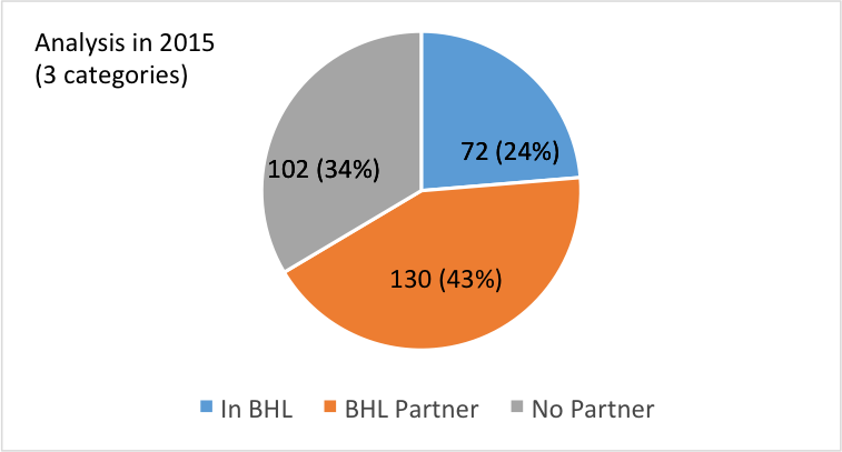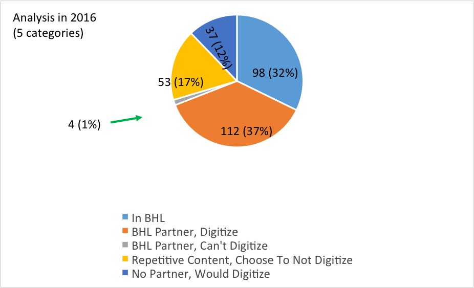 As the bibliography used included all editions of a particular work, regardless of whether the content had changed, I decided to not digitize the 53 works on the list whose content was already in BHL in another edition of the same work. As you can see in the graphs below, the number of fern books on BHL from this list has increased by 36% over the past year. The 112 titles from the list that are not yet in BHL but that we have access to via partner libraries will be in BHL after they are digitized. We lack access to only 37 of the titles on the list that would add content to BHL, and it will be interesting to follow up with this study to see if current partners acquire new resources or if new partners that possess these materials join the BHL Consortium.