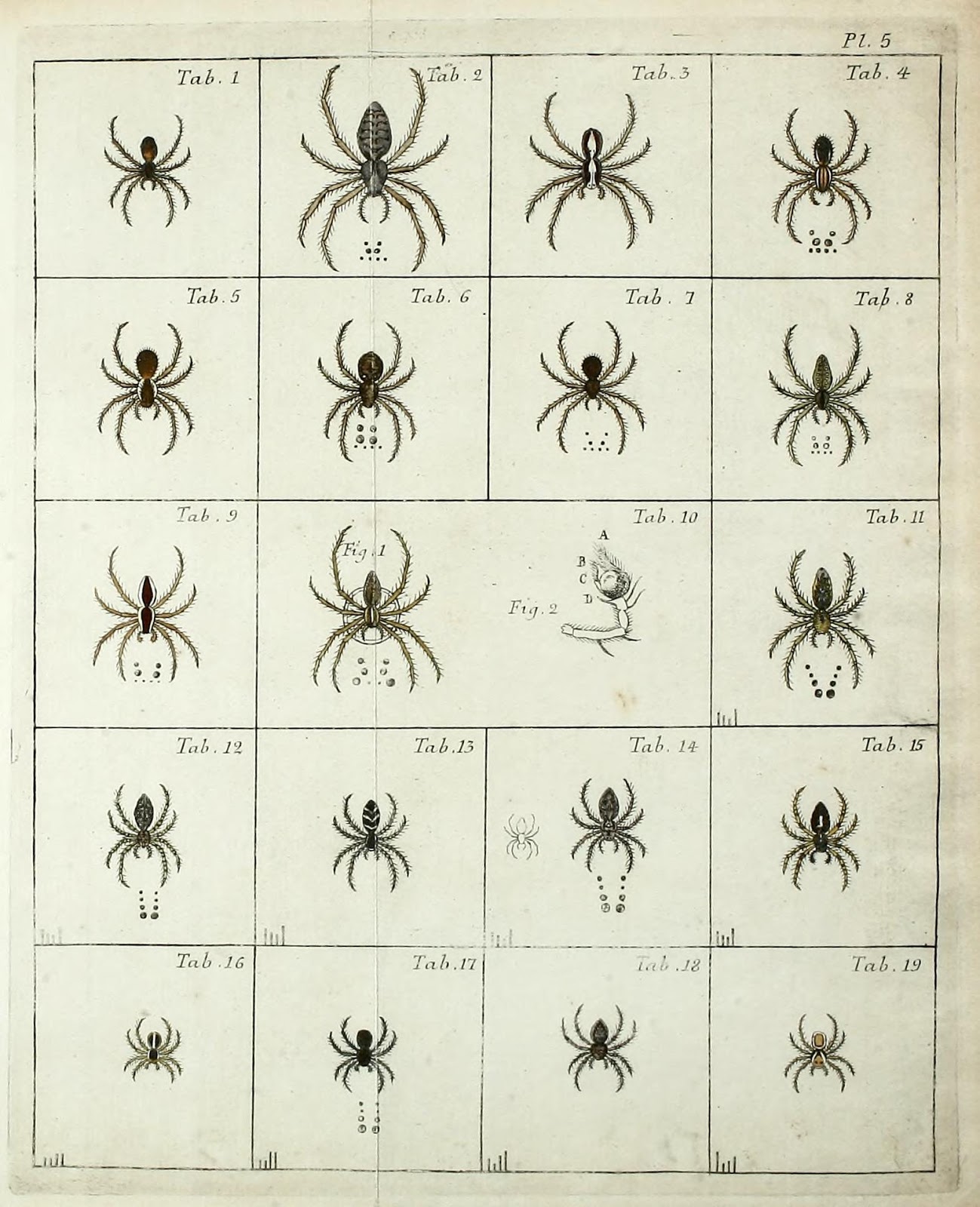 In 1793, the first English translation of Clerck’s Svenska Spindlar appeared under the title Aranei, or, A natural history of spiders, by Thomas Martyn. Martyn supplemented the text with additional illustrations originally published in Eleazar Albin’s Natural history of spiders (1736).