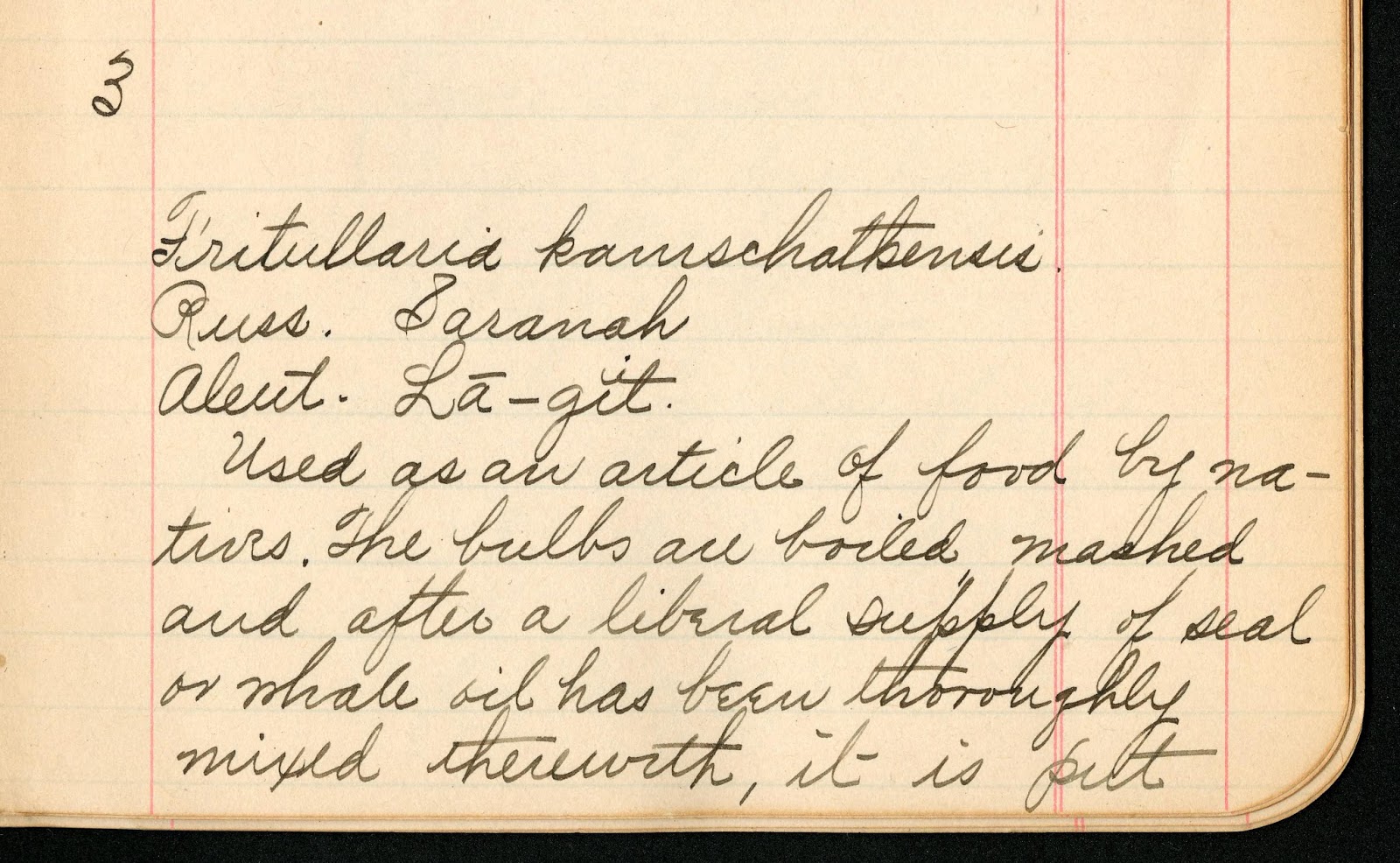 Entry three describes Fritullaria kamschathensis [Fritillaria camschatcensis], also known as the Kamchatka Fritillary, and lists general use and preparation: “Used as an article of food by natives. The bulbs are boiled mashed and after a liberal supply of seal or whale oil has been thoroughly mixed therewith, it is put away for winter’s use.”