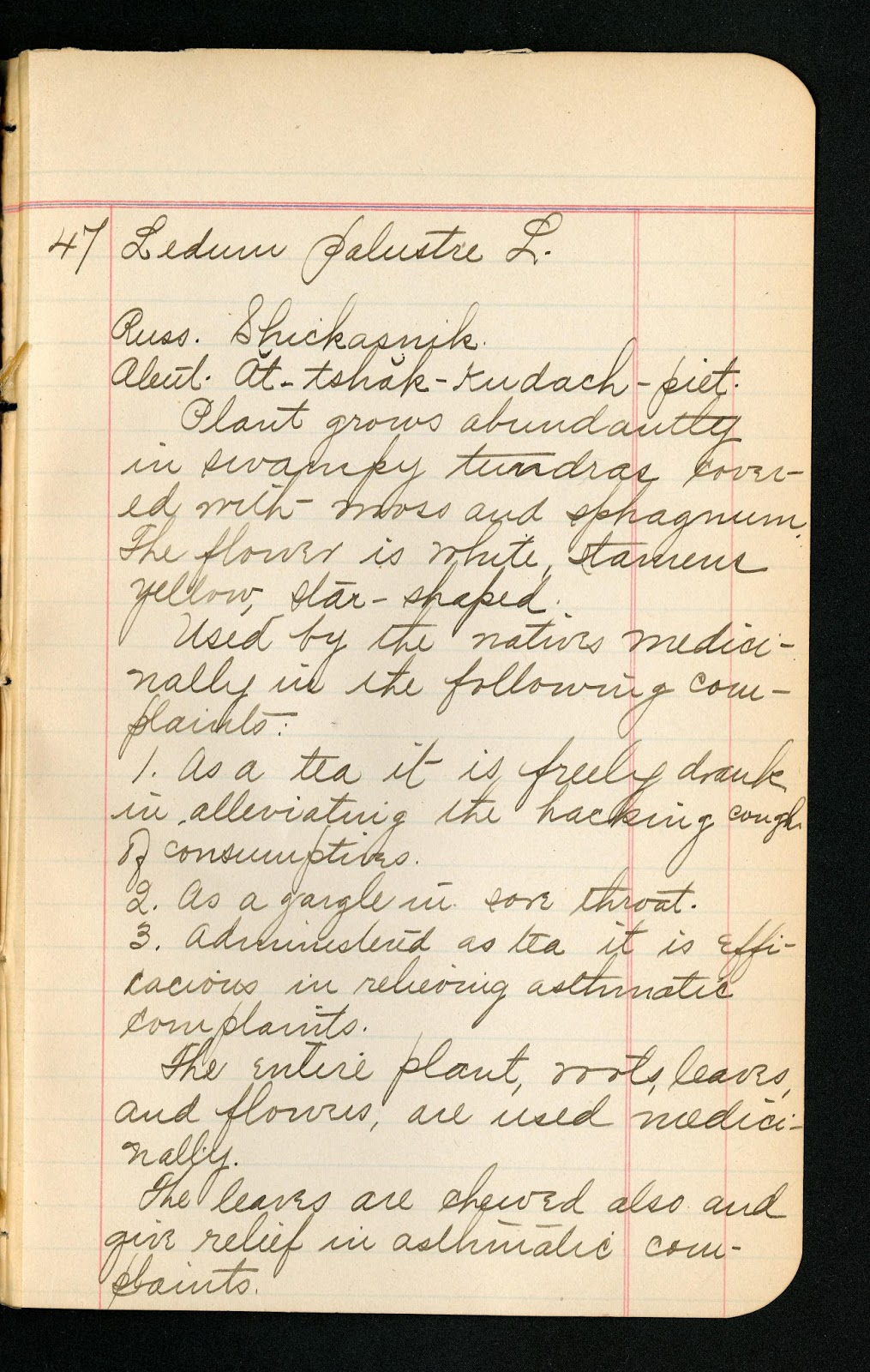 Fisher’s notebook documents his final years collecting and looks at the relationship between the Alutiiq (Aleut) and their plants by recording medicinal and food uses for 48 specimens. Only a handful of the specimen entries include the taxonomic names of plants; instead, entries focus on recording the Russian and Sugpiat/Alutiiq names of plants, how the plants were used, and plant distribution. Detail varies, as seen below in entries three and forty-seven.