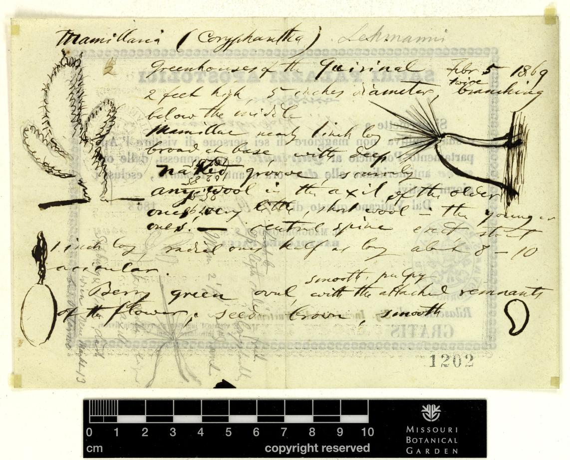 | George Engelmann : botanical notebook 5 : Mammilaria, Leuchtenbergia, Discocactus, and Melocactus. Box 3: Folder 13: Cactaceae: Mammillaria: 1857-1883 (1856). http://biodiversitylibrary.org/page/52030722 |