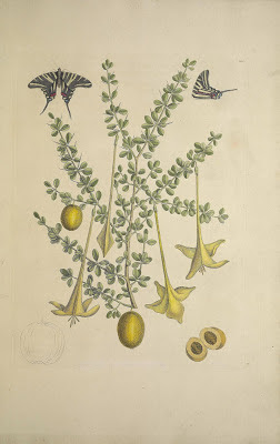 | Lily thorn (Catesbaea spinosa). Pictured with zebra swallowtail (Protographium marcellus). Catesby is the only source that Linnaeus cited when naming Catesbaea spinosa in Species Plantarum (1753). This engraving serves as the type for this name. Catesby, Mark. The Natural History of Carolina, Florida, and the Bahama Islands. v. 2, ed. 1. pl. 100. Digitized by Smithsonian Libraries. http://biodiversitylibrary.org/page/40680398. |