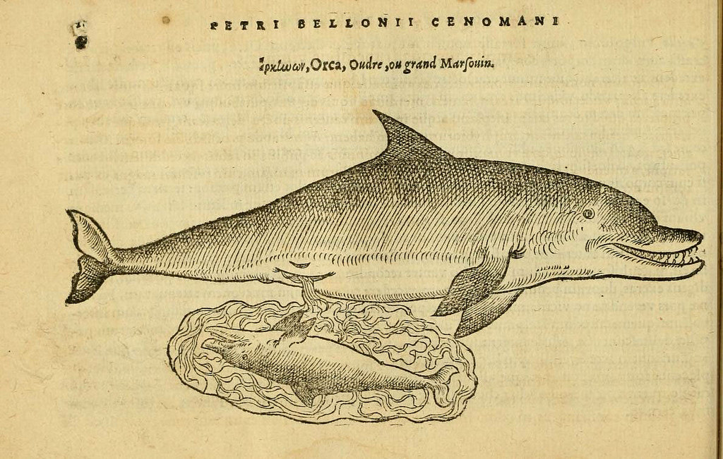 | Belon portrayed many dolphins, their embryos, and reproductive anatomy within De aquatilibus, marking the beginning of modern embryology. Illustrated by woodcut. Belon, Pierre. De aquatilibus. 1553. http://www.biodiversitylibrary.org/page/4770162. Digitized by Harvard University, Ernst Mayr Library, Museum of Comparative Zoology. |