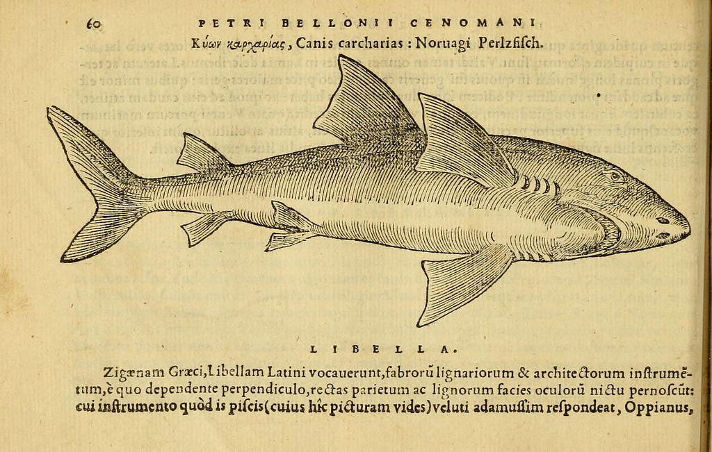 | Earliest known published illustration of a great white shark. Illustrated by woodcut. Belon, Pierre. De aquatilibus. 1553. http://biodiversitylibrary.org/page/4770204. Digitized by Harvard University, Ernst Mayr Library, Museum of Comparative Zoology. |