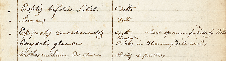 | Coptis trifolia or Three-leaf Goldenthread observed by John Torrey. Calendarium Florae for the Vicinity of New York by John Torrey. Digitized by The New York Botanical Garden. |